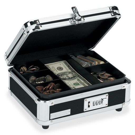 Sparcoin stockSteel cash box offers a combination lock for extra security. Lid tray features spring-loaded clips to hold paper money. Six-compartment tray for co...