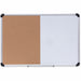 The ultimate organizer combination for any workspace. A versatile and functional combination board that is one half dry-erase magnetic lacquered steel writing surface and one half natural-cork bulletin surface. Equipped with a satin-finished aluminum frame that features attractive, rounded, plastic corner accents. Dry erase board wipes clean with eraser, cloth, or dry erase wipes. Markers, pushpins, and eraser are sold separately.