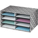 Ideal desktop organizer manages lighter workflow while organizing mail, forms or other letter-size literature in eight compartments. Each compartment measures 19-1/2" wide x 12-3/8" deep x 10-1/4" high. Stylish Brocade design in black and white blends with any decor. Organizer includes plastic channels and labels for setting up a desktop index system.