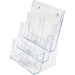 Compact desktop literature holder features a three-tier design with six pockets so you can display a variety of leaflets. Each pocket displays literature in stacks up to 1-1/2" thick. Literature holder is made of crystal-clear plastic. Use as a stand-alone display on countertop or mount on a wall.