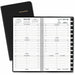 Classic weekly appointment book comes complete with dated appointment section, tabbed telephone/address section and memo pad, making planning easy and efficient. Dated planning pages range 12 months from January to December. Two-page-per-week spreads offer ruled daily entries, hourly appointment times from 8 AM to 5 PM, Monday-through-Sunday scheduling, count of days/days remaining, and current, past and future months reference at the top of the first page. The current reference month is outlined with a box, and the current week is highlighted in the reference month. Refillable appointment book also features concealed wire binding and a simulated leather cover.