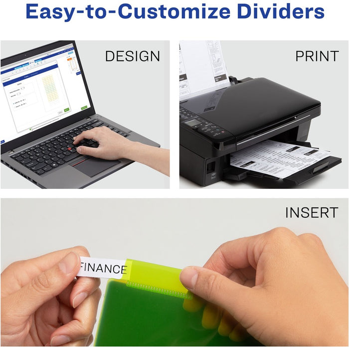 Simplify your life in moments with this set of Big Tab Insertable Plastic Dividers. The unique Big Tab design features a secure indent point that keeps inserts from falling out while also having a larger cutout for easy access. Larger divider tab also allows 1.5 times more space for printing and writing than regular dividers. Each divider is created with a durable, tear-resistant plastic material that withstands frequent use. Transparent plastic makes it easy to view your documents at a glance for instant reference. These three-hole punched dividers are perfect for organizing any project whether it's in the office, the classroom or at home. A sheet of printable tab inserts is included that is compatible with both inkjet and laser printers. Customize these inserts with your own fonts, images and text with easy-to-use downloadable templates.