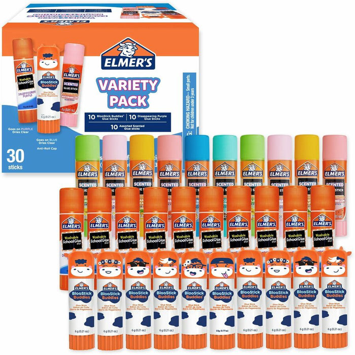 Inspire your child's next craft or school project with a Glue Sticks Variety Pack. This variety pack offers Scented Glue Sticks, Disappearing Purple Glue Sticks and Disappearing Blue Glue Sticks. Glue sticks are a fun way to attach items to paper, display boards, foam boards, photos and more. Take advantage of the washable, nontoxic and mess-free bonding while enjoying the fun assortment of scents in every project. For even less mess, Disappearing Glue Sticks provide visible color on contact but dry clear. Keep imaginations growing with the Glue Stick Variety Pack, not messes.