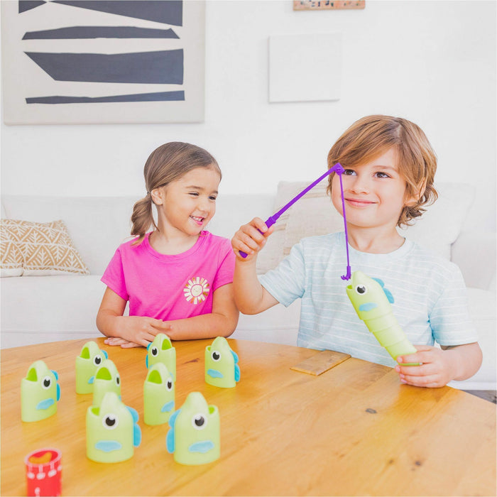 School your children with this whopper of a game that's fun for the whole family. Players use a fishing pole to catch telescoping fish and measure them against the included cards. Game includes a fishing pole, 12 fish, four measuring cards and game guide. Fish are flat during game play but extend to various lengths once caught. Introduce the concept of measurement and the idea of small, medium and large to help children understand the correlation between size and measurement. Game is perfect for two to three players ages 3 and up.