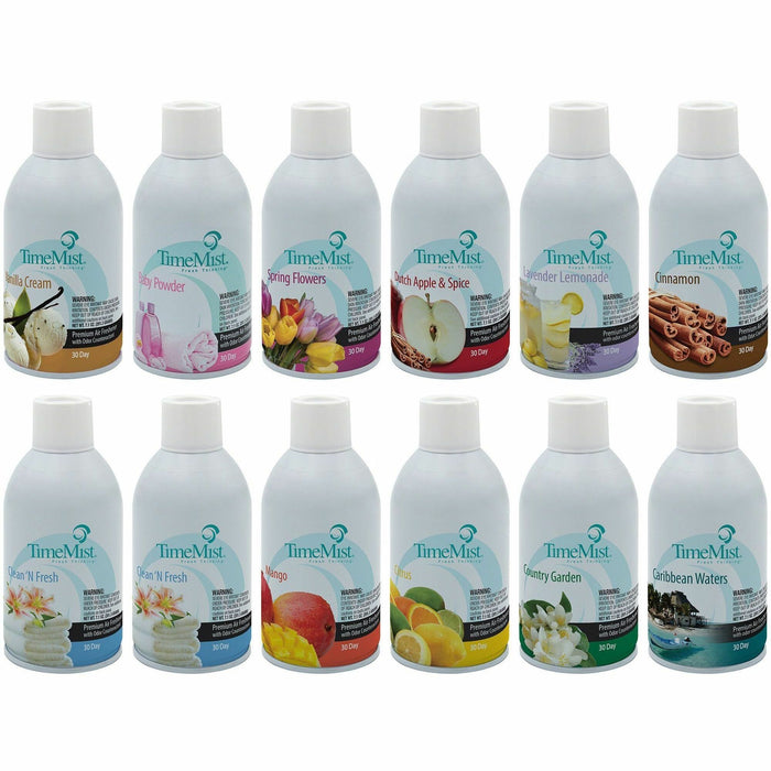 Experience a variety of fragrances with this mixed refill assortment for use in all full-size, TimeMist Metered Dispensers including ZEP 3000 Ultra and 3000 Ultra Plus. Each refill contains fragrance and odor counteractants. Complex, premium fragrance with essential oils ensures a long-lasting experience. Robust scents include Clean & Fresh, Mango, Citrus, Country Garden, Caribbean Waters, Vanilla, Lavender Lemonade, Dutch Apple Spice, Spring Flowers, Baby Powder and Cinnamon. Dual odor counteractants are specially designed to combat strongest malodors. Each refill lasts a full 30 days of continuous use when set at 15-minute intervals.
